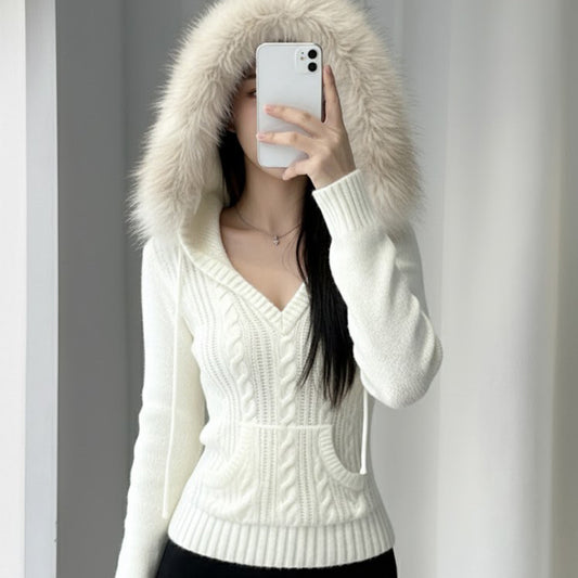 Hooded fur V-neck woven top slim fit and slimming jacket