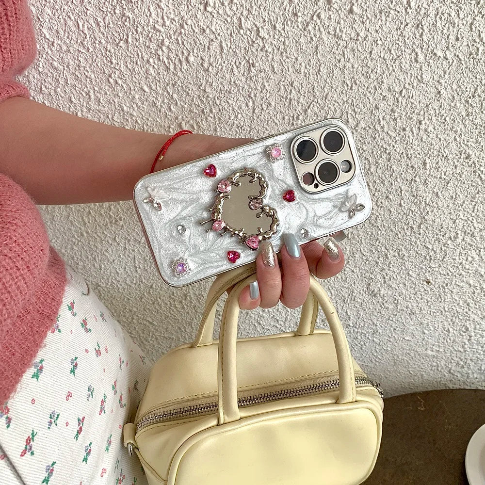 Glitter Diamond Heart Makeup Mirror Ballet Shoes Phone Case For iPhone 16 15 14 13 12 11 Pro Max Plus XR X Protective Cover